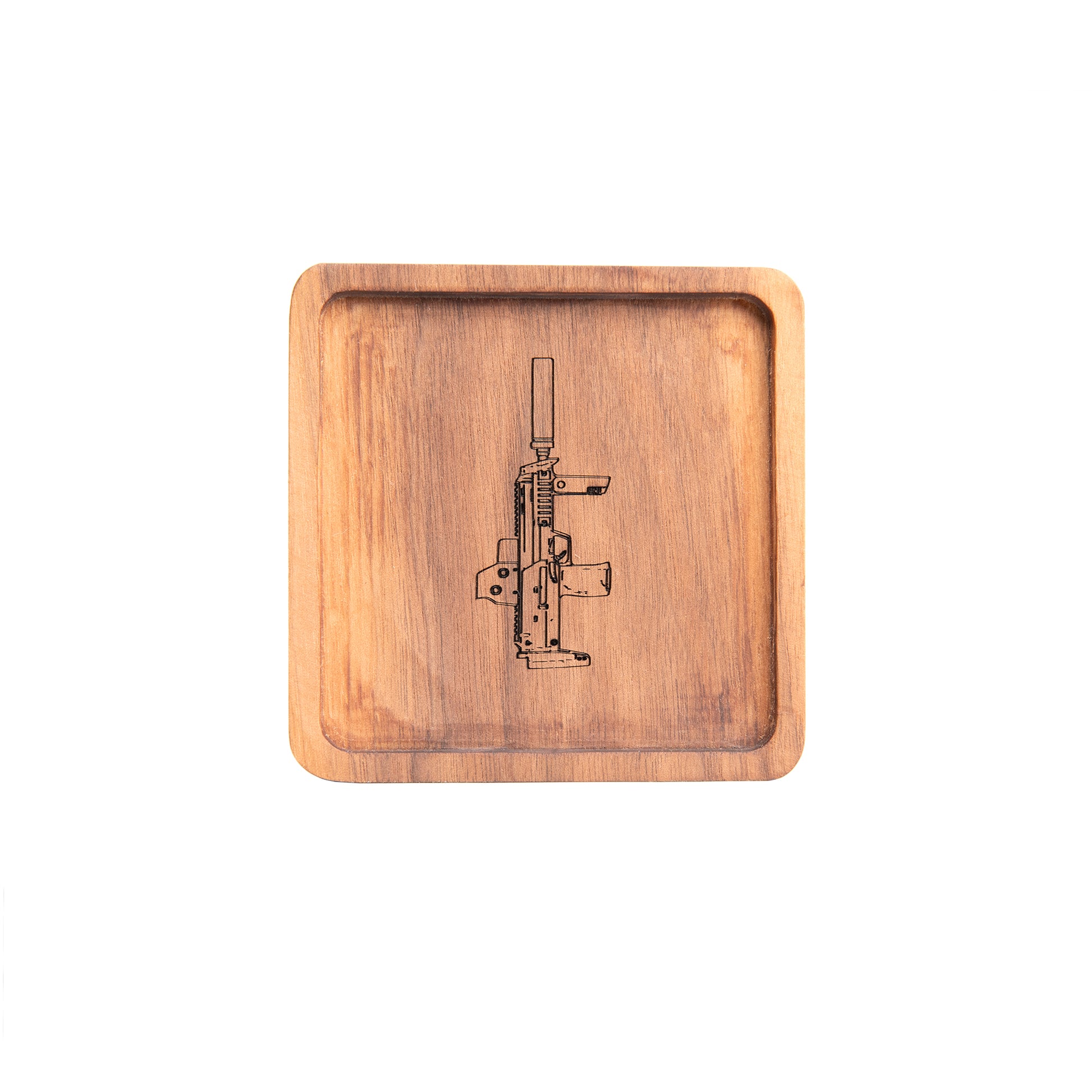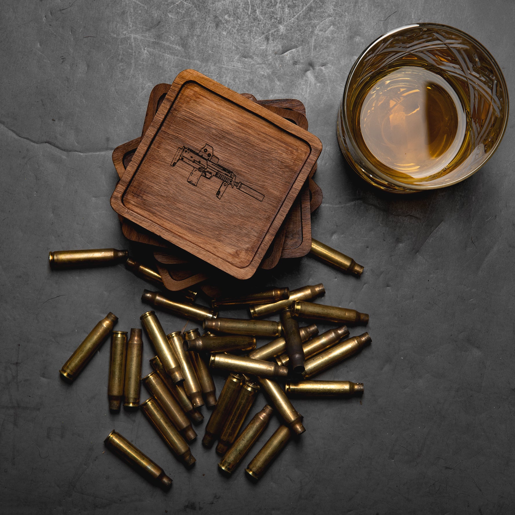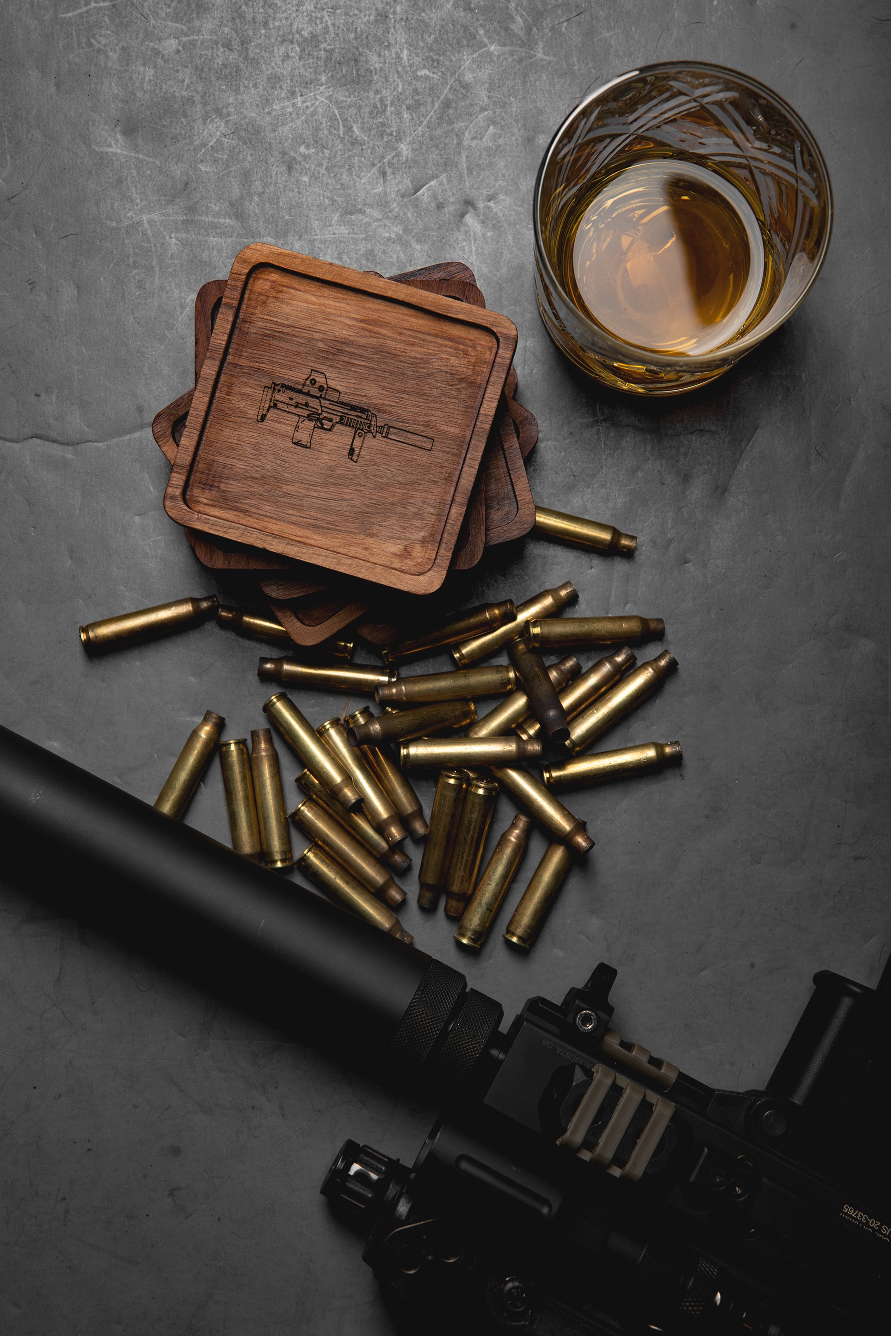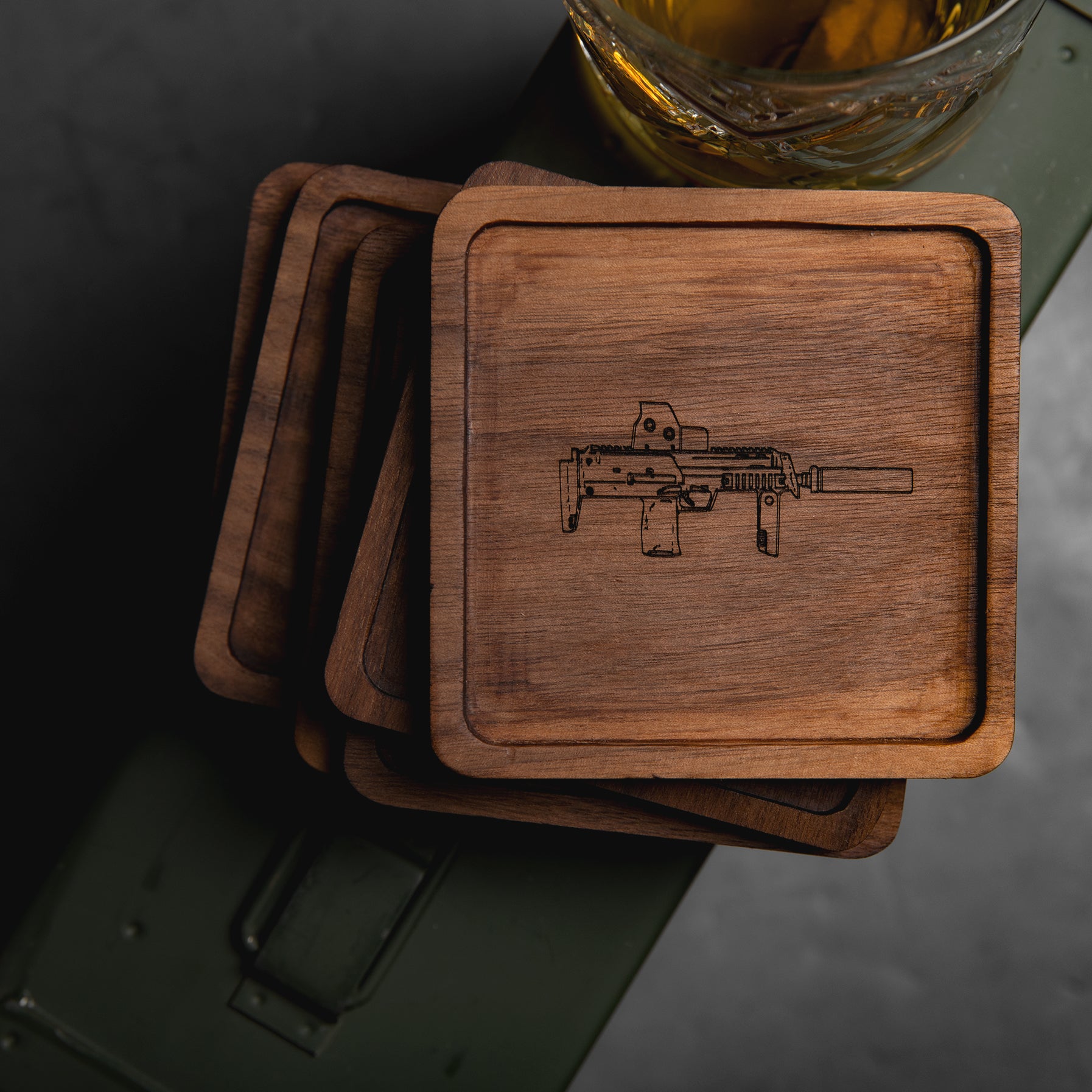 Custom laser engraved MP7 wooden coasters. This will easily elevate your favorite bourbon to the next level...or add some pizazz to your neato can of Sprite if you're a nerd.